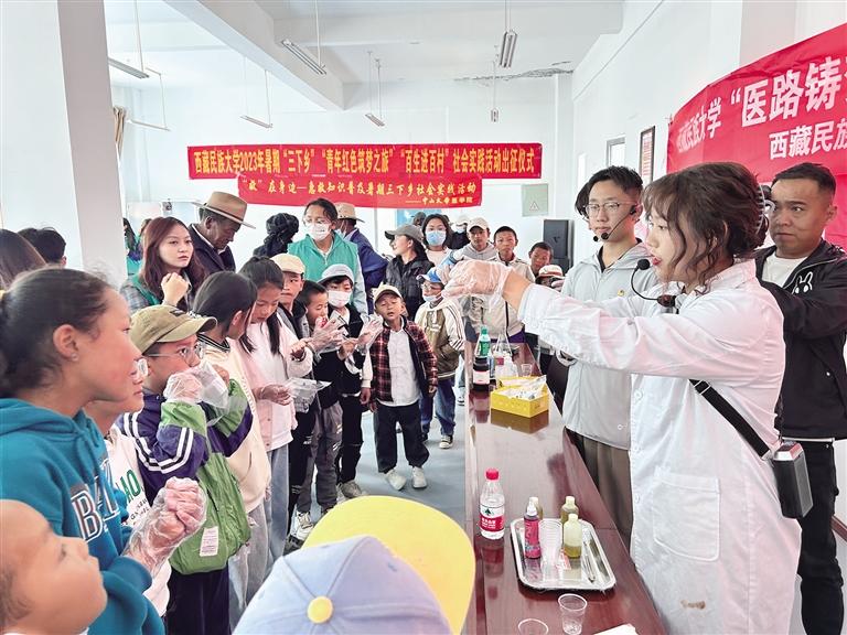 出征儀式上,大學(xué)生理論宣講團(tuán)成員以黨的二十大報(bào)告為切入點(diǎn),結(jié)合在成長(zhǎng)過(guò)程中所學(xué)、所見(jiàn)、所聞,向社區(qū)干部和居民宣講。東南大學(xué)副教授廖望為居民宣講合理膳食醫(yī)學(xué)知識(shí)。中山大學(xué)醫(yī)學(xué)院教授楊中漢用通俗易懂的語(yǔ)言,詳細(xì)講述了急救技能、自救措施,并用假人模型進(jìn)行現(xiàn)場(chǎng)展示,贏得了大家的陣陣掌聲。文藝宣傳隊(duì)成員為社區(qū)居民帶去了豐富多彩的文藝演出,演出以歌舞為主,傳統(tǒng)鍋莊、熱巴舞、芒康弦子舞、新疆舞、街舞等舞蹈精彩紛呈,歌曲以獨(dú)唱合唱形式,圍繞禮贊中國(guó)共產(chǎn)黨,禮贊新時(shí)代、新西藏等主題,豐富了社區(qū)群眾的精神文化生活。