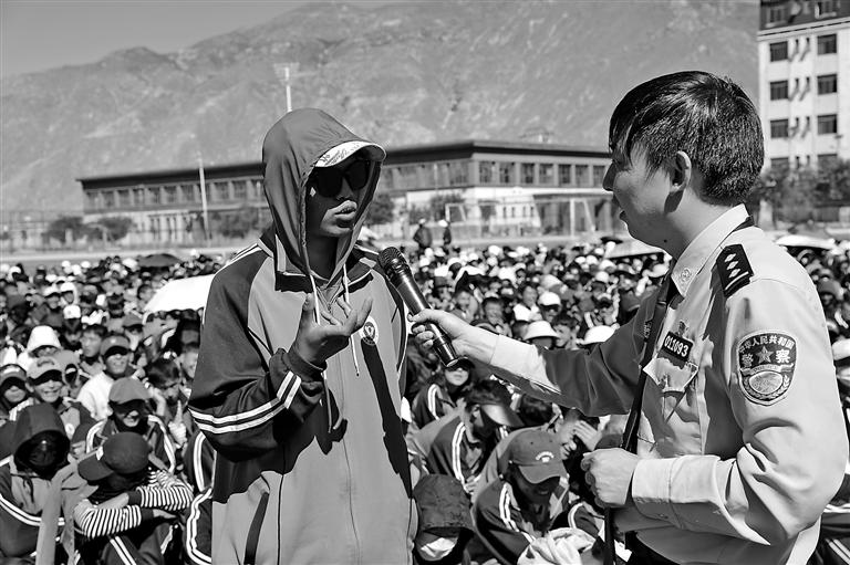宣傳活動中,拉薩市第一中等職業(yè)技術學校學生和區(qū)公安廳網安總隊民警熱情互動。記者 彭琦 攝