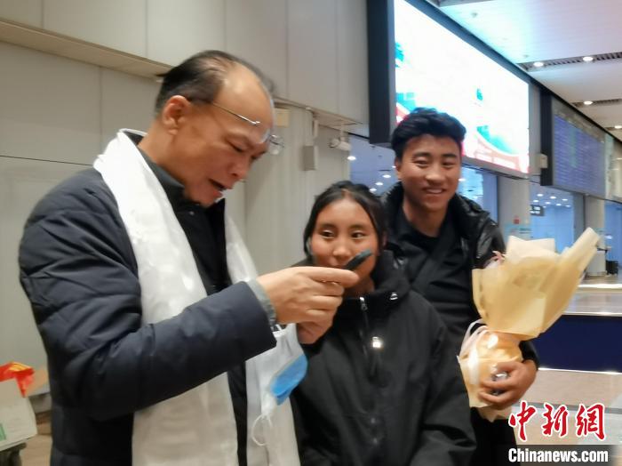 11月14日下午,來自西藏自治區(qū)昌都市的8名脊柱側(cè)彎患者到達北京首都國際機場。圖為北京大學(xué)第一醫(yī)院骨科主任李淳德(左)和藏族女孩澤巴央宗、哥哥貢布鄧珠交談。 徐雪瑩 攝