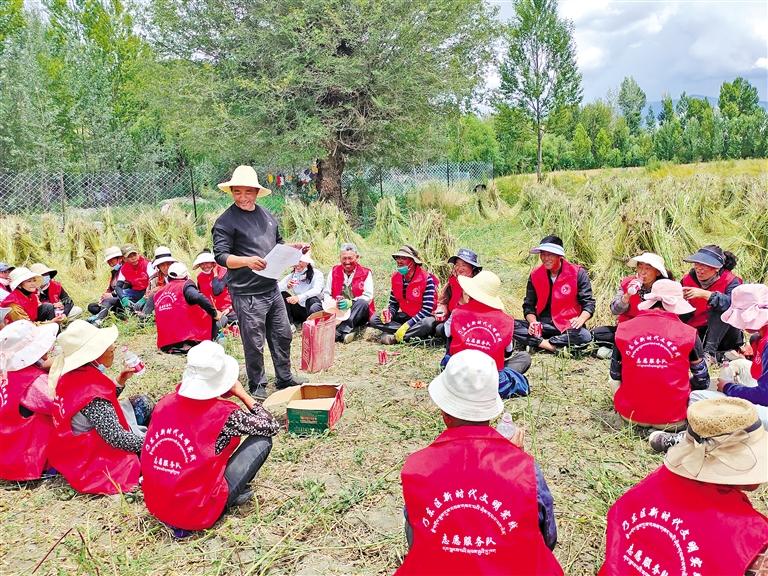 圖為乃東區(qū)新時代文明實踐志愿服務(wù)隊在田間地頭學習強農(nóng)惠農(nóng)政策。記者 劉楓 攝