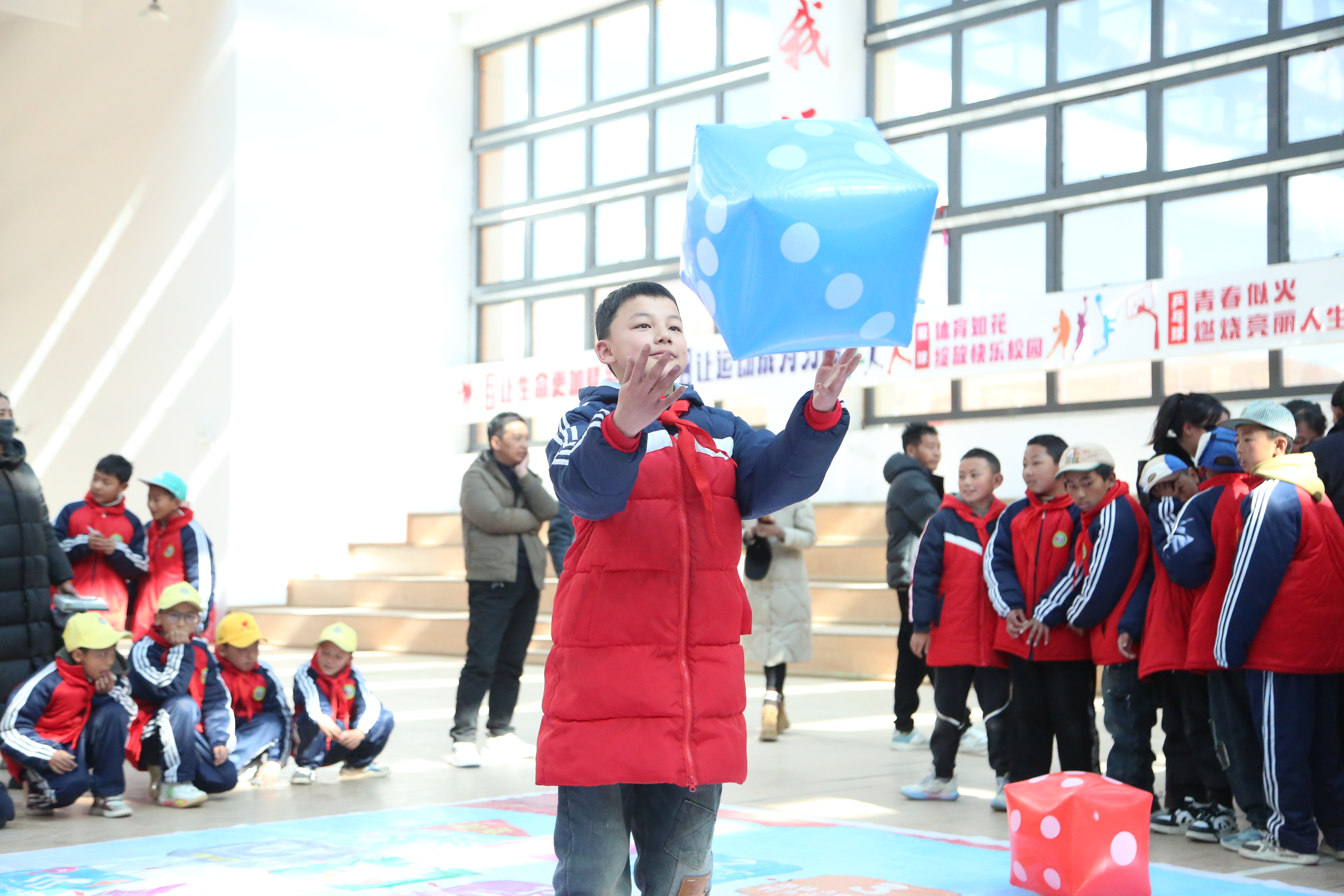 活動(dòng)現(xiàn)場引入比賽機(jī)制,100多名學(xué)生歡聚在操場上玩起占地6米乘6米的超大棋盤。擲骰子、跳格、快速回答法律問題、完成相應(yīng)任務(wù)、領(lǐng)取獎(jiǎng)勵(lì)......場上歡聲不斷,場外躍躍欲試?!斑@個(gè)‘法治飛行棋’真好玩,玩游戲的同時(shí)還能學(xué)習(xí)法律知識(shí),比坐在教室里聽講好多了,還獲得了好多小禮品?!蔽迥昙?jí)2班的珠薩同學(xué)高興地告訴記者。