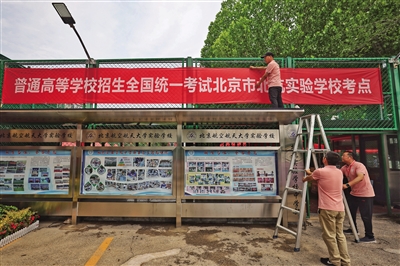 6月6日,記者在北京航空航天大學(xué)實(shí)驗(yàn)學(xué)校中學(xué)部(簡(jiǎn)稱(chēng)“北航實(shí)驗(yàn)學(xué)?!保┛键c(diǎn)看到,學(xué)校西門(mén)處已懸掛起高考考點(diǎn)橫幅、考場(chǎng)布置已就位,校園內(nèi)放置了多個(gè)溫馨的提示語(yǔ)標(biāo)牌。據(jù)悉,該校是今年新增高考考點(diǎn)之一,承接來(lái)自9所學(xué)校277名考生的高考組考任務(wù)。此外,記者還探訪(fǎng)了北京高考人大附中經(jīng)開(kāi)學(xué)??键c(diǎn)