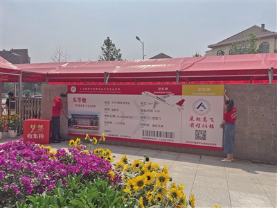 “2024高考加油”“高考就是高高興興地考試”“保持靜心,增強(qiáng)信心,做題專(zhuān)心,考試細(xì)心”……考生一進(jìn)考點(diǎn),就可以看到這些鼓舞人心的標(biāo)語(yǔ)。走出考點(diǎn)時(shí),一張巨型“圓夢(mèng)號(hào)”頭等艙登機(jī)牌映入學(xué)生眼簾,祝??忌鷤冋钩岣唢w,前程似錦。