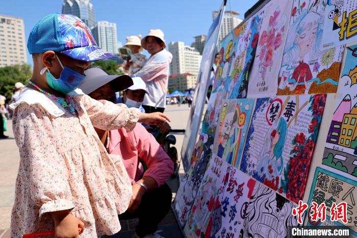 圖為小朋友和家長觀看禁毒知識手繪。薛蒂 攝