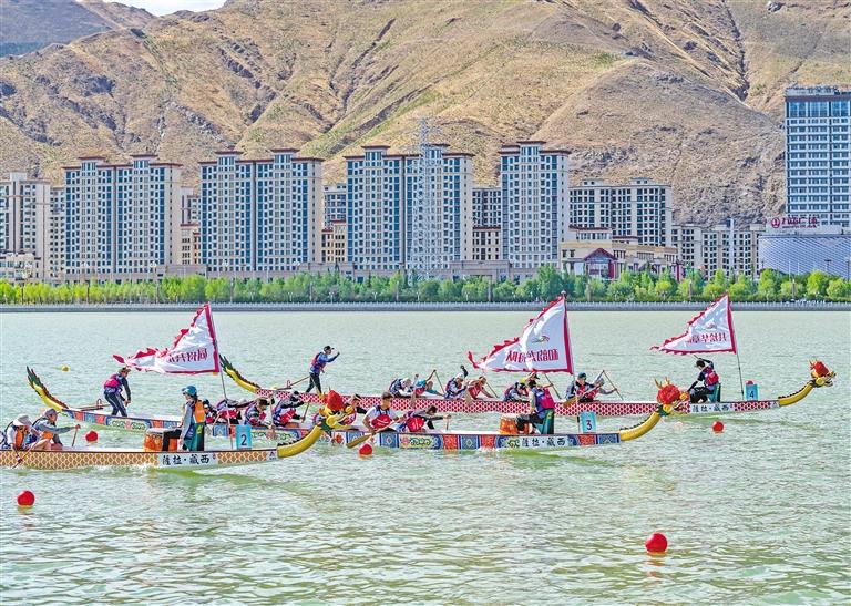 在拉薩首次舉辦的中國海拔最高的城市龍舟賽。新華社記者 孫非 攝