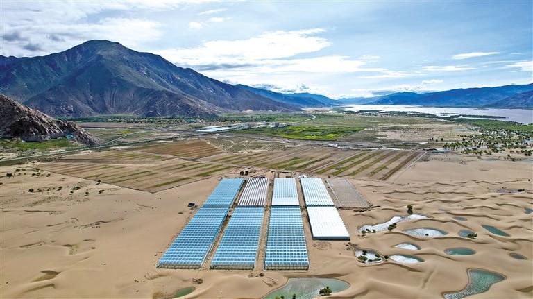 國家農(nóng)業(yè)產(chǎn)業(yè)化示范企業(yè)——西藏綠之源現(xiàn)代農(nóng)業(yè)科技股份有限公司二期項目,如同一片“綠洲”鑲嵌在沙丘之中。