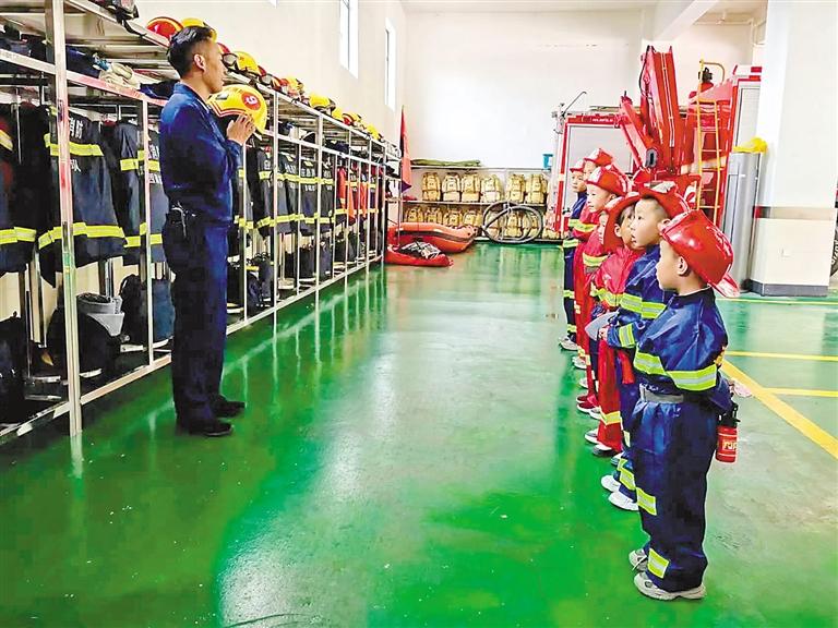 活動(dòng)中,消防員為孩子們介紹消防裝備。