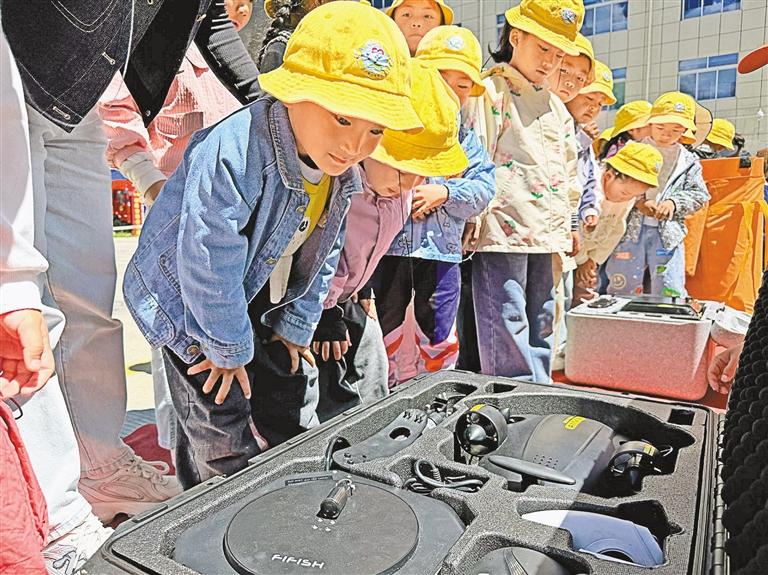 山南市第三實(shí)驗(yàn)幼兒園師生參觀器材裝備。