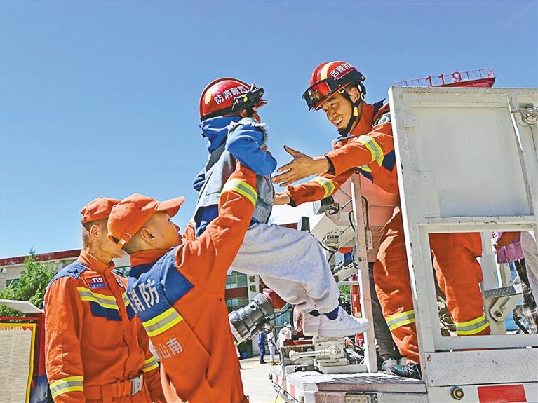 在山南市湖南路特勤站,小朋友在消防員陪同下體驗(yàn)乘坐云梯車。