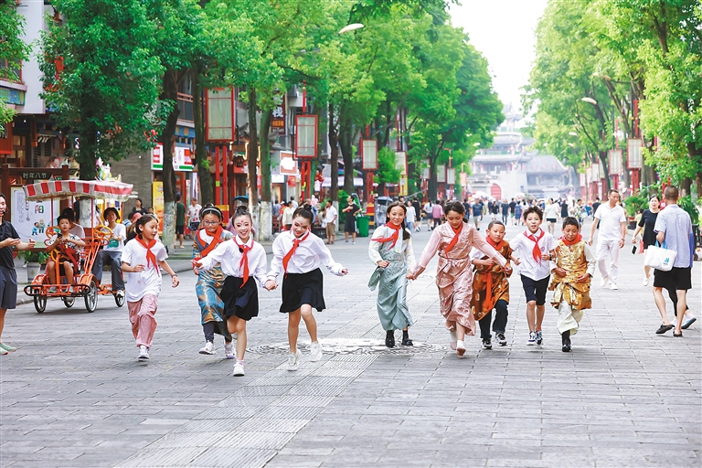 圖為藏渝兩地學(xué)生手牽手奔跑在山城街頭。通訊員 擁金卓嘎 攝