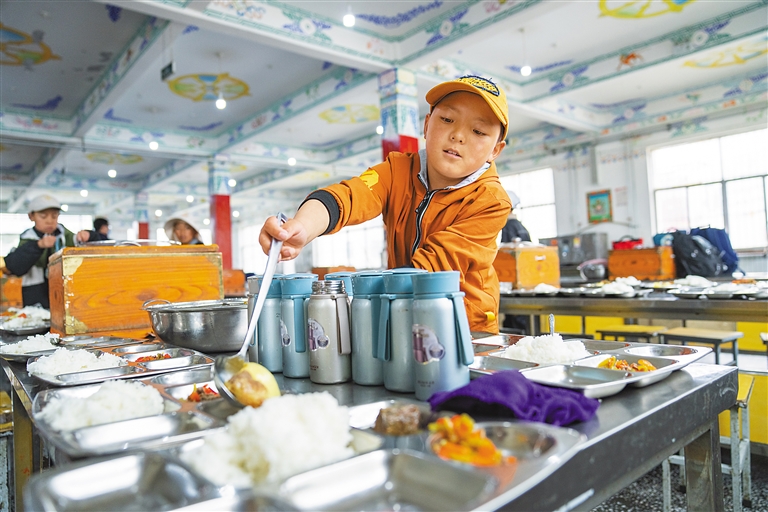 圖為那曲市班戈縣中石化小學(xué)學(xué)生在為同學(xué)們分發(fā)午餐(6月22日攝)。新華社記者 丁增尼達 攝