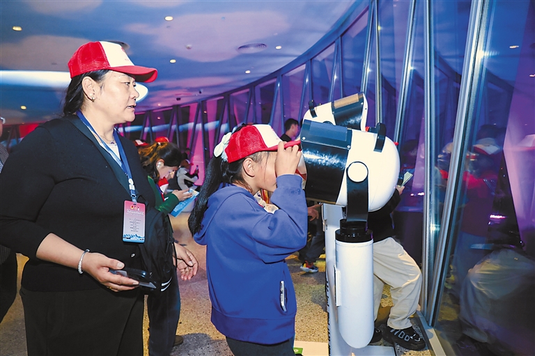 圖為參加冬令營研學(xué)交流活動的波密少先隊員在廣州塔用共享望遠鏡眺望廣州城市夜景。記者 謝筱純 攝