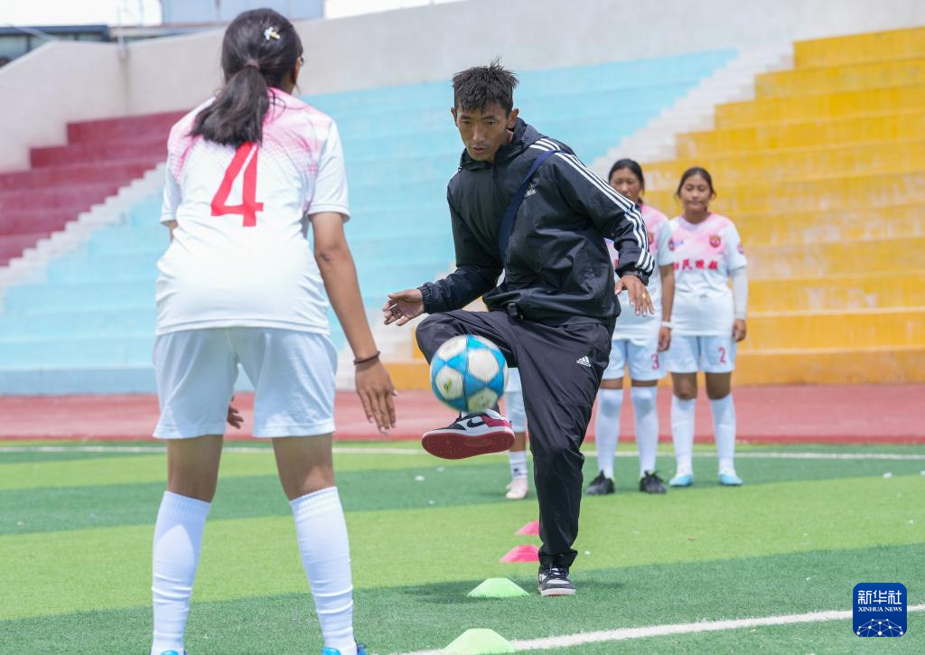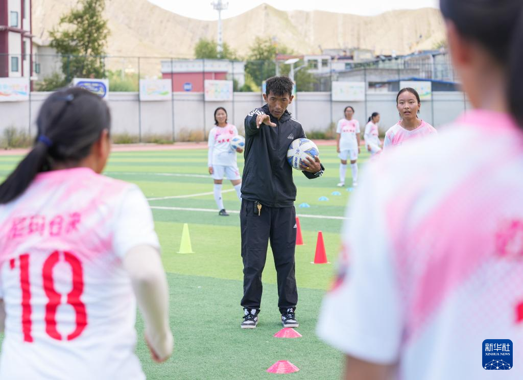 西藏日喀則市上海實驗學(xué)?!爸榉逖棥迸幼闱蜿牻叹毬宀忌T诓賵錾现笇?dǎo)球員訓(xùn)練(9月3日攝)。新華社記者 丁汀 攝