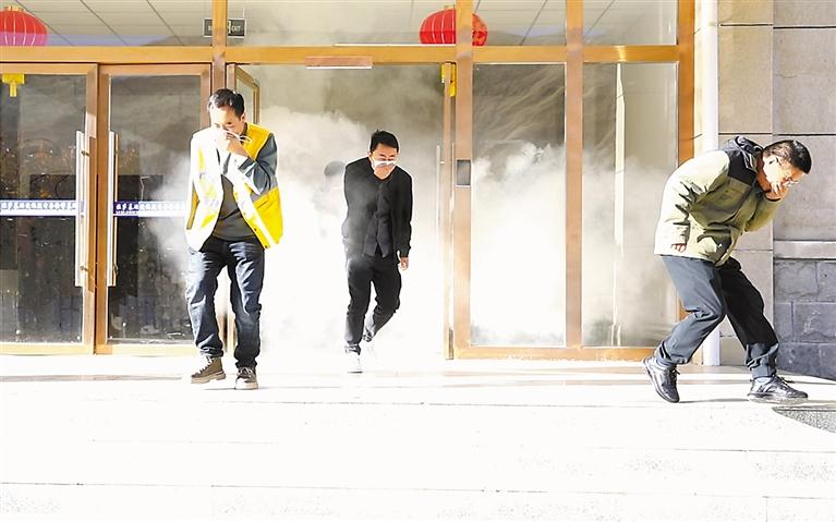 圖為干部職工進行應(yīng)急消防演練。記者 旦增蘭澤 通訊員 拉巴次仁 攝