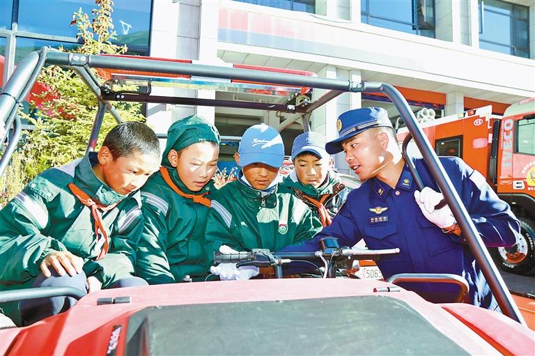 圖為消防員為學(xué)生講解消防器材使用方法。記者 格桑倫珠 攝
