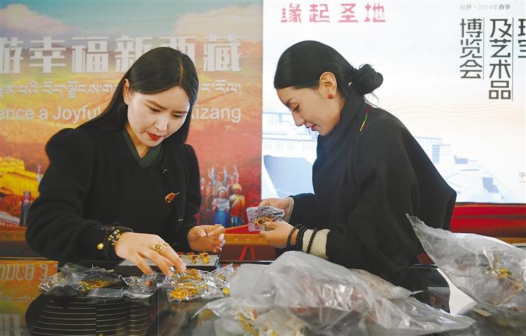 4月24日,2024年春季中國西藏珠寶及藝術(shù)品博覽會在自治區(qū)會展中心開幕。博覽會現(xiàn)場熱鬧非凡,許多市民游客前來參觀、選購商品,共同感受西藏文化的獨特魅力。 圖為參展商在整理展位上的商品。 記者 王敏 攝