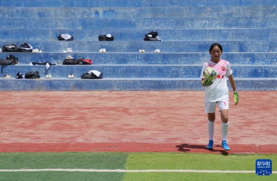 在西藏日喀則市上海實驗學校,“珠峰雪鷹”女子足球隊守門員邊普在操場上訓練(9月3日攝)。新華社記者 丁汀 攝