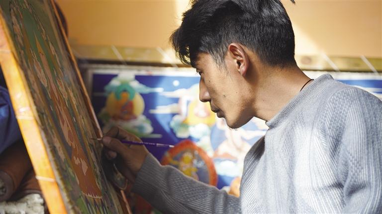 屋內(nèi),是他伏案繪制唐卡的專(zhuān)注身影;身旁,是父母欣慰的目光與陪伴?!白詮膶W(xué)會(huì)了唐卡繪畫(huà)后,我一直在拉薩就業(yè)謀生,但由于家里有年邁的父母需要照顧,我就回到家里一邊照顧父母,一邊繪畫(huà)定制的唐卡。這樣不僅有穩(wěn)定的收入,還能像其他人一樣靠自己的雙手過(guò)上幸福的生活?!蹦岈敶稳始?dòng)地告訴記者,他的話語(yǔ)中充滿(mǎn)了對(duì)生活的感恩和對(duì)未來(lái)的信心。