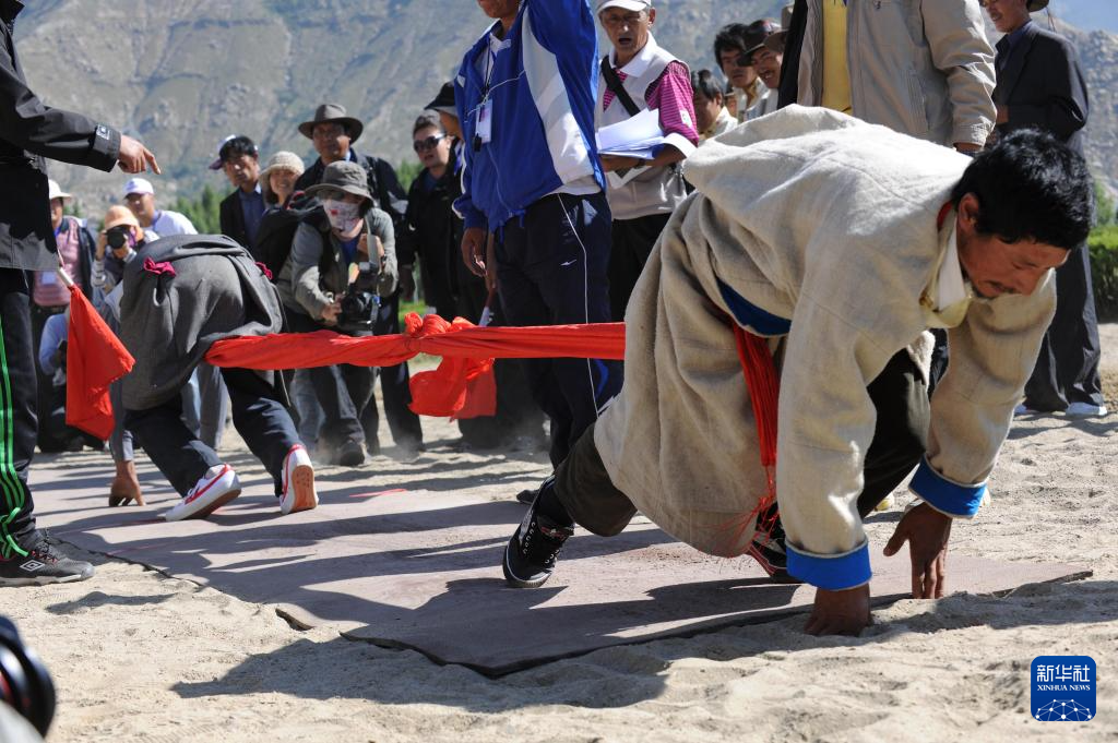 押加是一項(xiàng)在西藏地區(qū)廣為流傳的運(yùn)動(dòng),也被稱(chēng)為“大象拔河”。在比賽中,選手需四肢著地,背對(duì)背彼此發(fā)力,直到一方將中間的墜條拉過(guò)自己一側(cè)的決勝線。