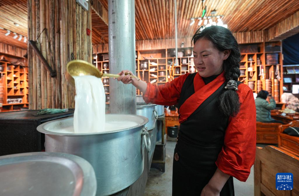 “牧人寶庫”藏式茶館服務(wù)員在熬制奶茶(2月13日攝)。新華社記者 晉美多吉 攝??