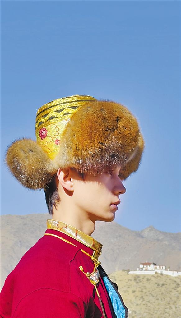 “朗霞”藏語意為氆氌帽,是墨竹工卡縣女性服飾的重要組成部分。這種帽子以黑色氆氌做底,兩側(cè)鑲有花邊,后面翹有兩個角,實用又美觀,成為女性展示自身魅力的重要配飾。帽子的裝飾因年齡和身份的不同而有所差異,年輕女孩戴的帽子裝飾較多,花紋圖案豐富,頂上為八瓣花,代表著吉祥八寶(傳統(tǒng)圖案)的數(shù)量;成年女性的帽子則少些花俏,更為沉穩(wěn);老年婦人的帽子則簡潔大方,透露出歲月的積淀與智慧;而僧尼的帽子則為絳紅色,彰顯著她們的宗教身份與信仰。