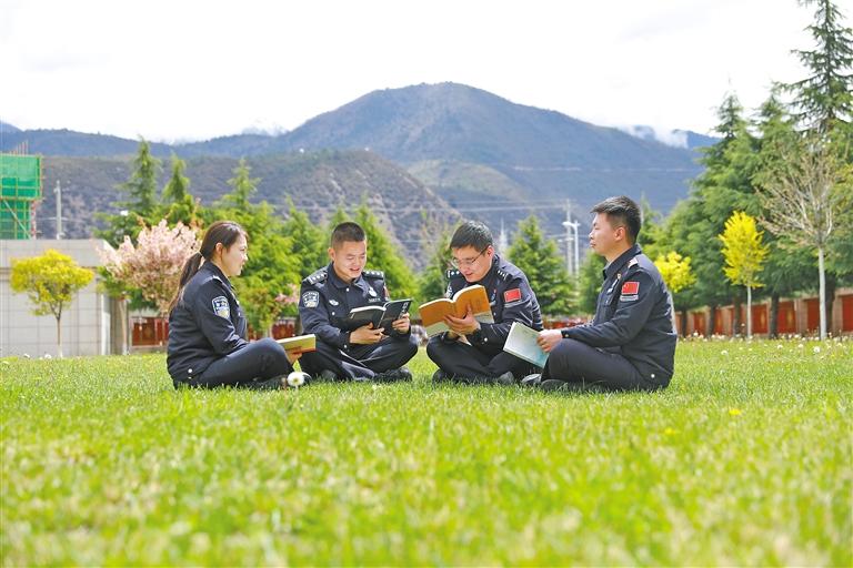 圖為林芝邊境管理支隊機關(guān)民警圍坐在一起讀書。 記者 彭琦 通訊員 張力 攝