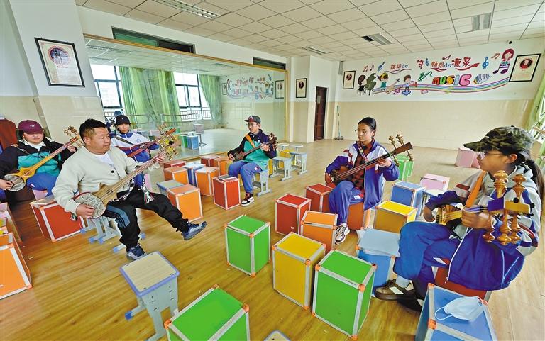 圖為拉薩市第四中學學生在扎念琴社團課上與老師共同彈奏扎念琴。記者 唐斌 攝