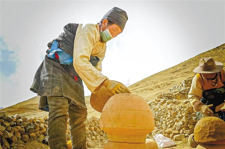 彭崗陶器制作工序繁復,需歷經(jīng)取土、運輸、粉碎、塑型、曬干、上水、燒制、成型、上漆(釉)等9道流程。僅取土環(huán)節(jié)便大有門道。年幼的桑珠緊隨舅舅,攀上海拔4475米的扎拉山山頂,在那處獨特土源地采擷優(yōu)質(zhì)黏土。