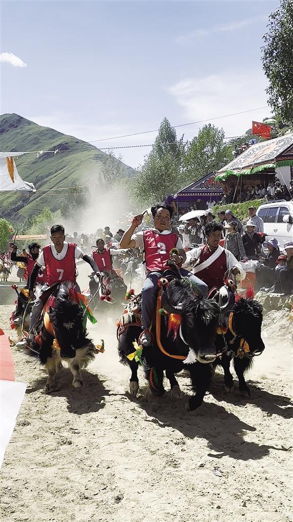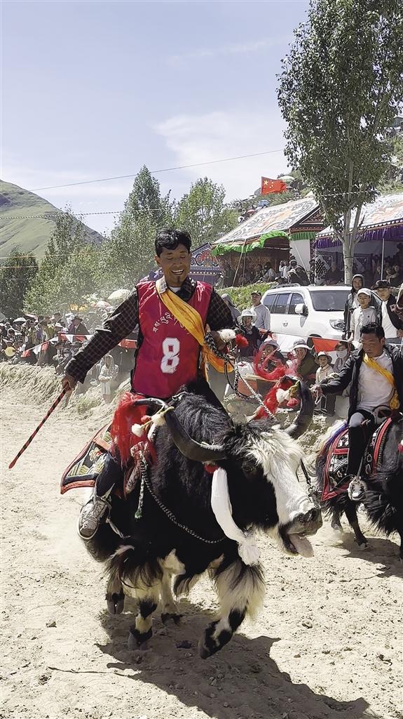 隨后登場的賽牦牛更是將氣氛推向高潮。這些被精心裝扮的牦牛,頭戴彩飾,頸掛銅鈴,在主人的駕馭下邁著既穩(wěn)健又不失迅猛的步伐沖向終點。與賽馬的靈動不同,賽牦牛更顯沉穩(wěn)有力,銅鈴聲與觀眾的吶喊聲交織在一起,充滿了濃郁的鄉(xiāng)土氣息。參賽選手次仁笑著說:“這頭牦牛我養(yǎng)了五年,每年就等這一天證明它的實力!”