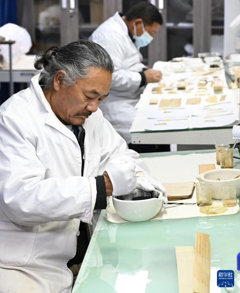 5月25日,布達拉宮貝葉經(jīng)實驗性修復小組實驗室工作人員在對用于貝葉修復的顏料進行研磨處理。新華社記者 旦增尼瑪曲珠 攝