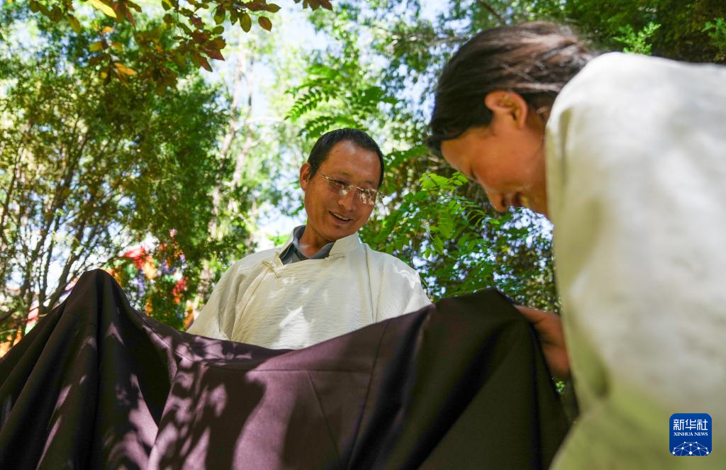 洛桑麥朗在檢查做好的藏裝(8月15日攝)。新華社記者 晉美多吉 攝 ??