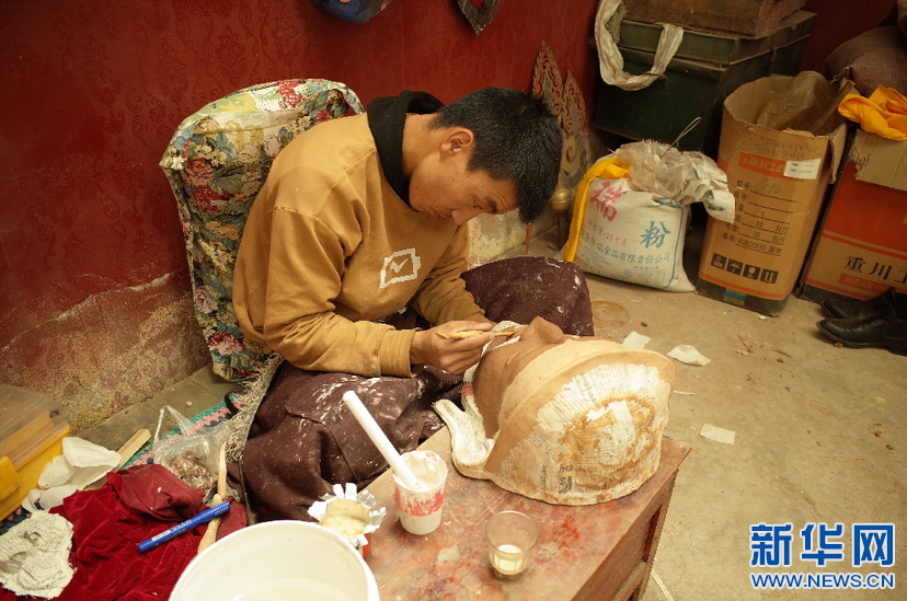 在西藏拉薩市達(dá)孜區(qū),西洛的學(xué)徒旦增扎西在給面具塑形(5月15日攝)。新華社記者 格桑邊覺 攝