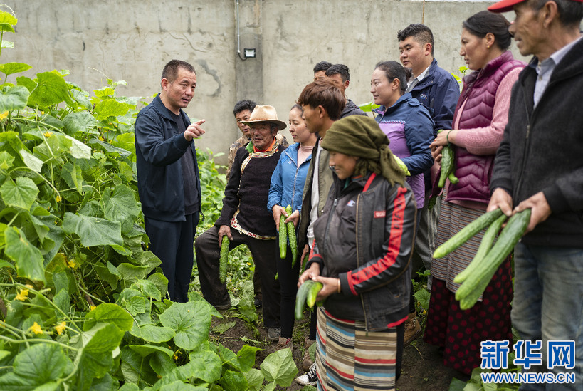 7月30日,西藏自治區(qū)供銷合作社社有企業(yè)負(fù)責(zé)人趙全(左一)給當(dāng)?shù)厝罕娭v解蔬菜種植知識。新華社記者 普布扎西 攝