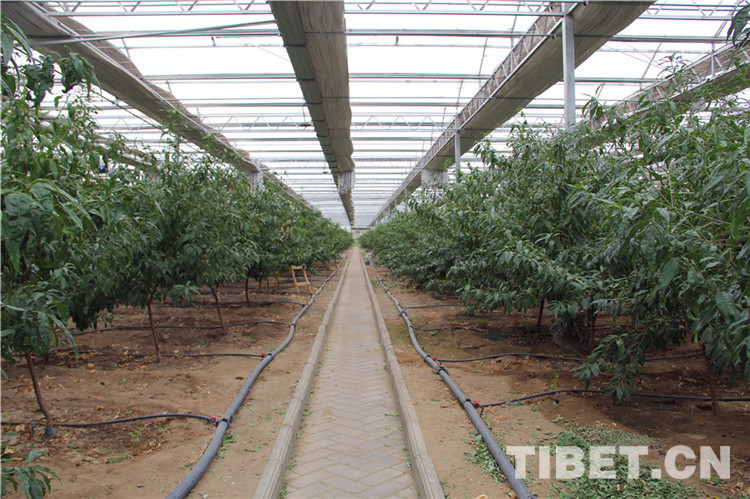 在高原上栽好一棵桃樹需要傾注更多的心血。經(jīng)過大棚的中控室,王榮華說:“這里晝夜溫差大、紫外線強(qiáng),冬天的時候還要澆凍水、拉膜蓋土、給樹打防凍液,在高原發(fā)展果樹種植困難不少。不同于內(nèi)地的桃樹,在這里快4年了,露天的桃樹只長高兩三米?!闭f到這里,他不由感慨科技種植的力量:“大棚里的桃樹一年就長到3米多高,并且掛果了?;叵?017年時,露天種下的桃樹只有手指粗細(xì),如今長勢這么好,真有點(diǎn)不可思議。”