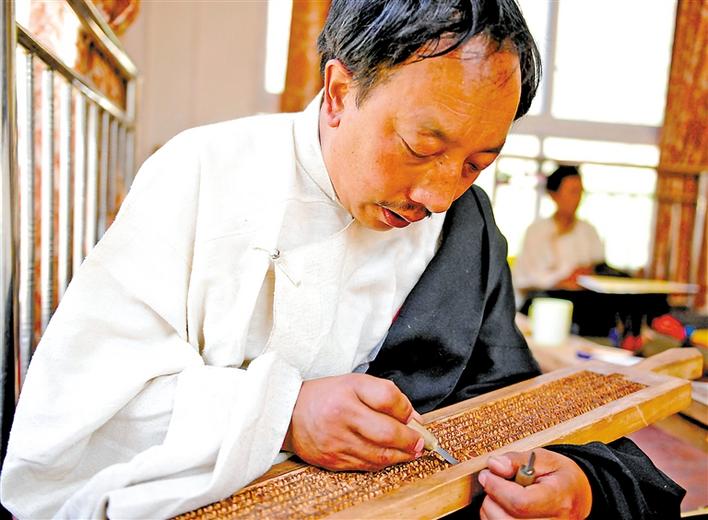 江達(dá)波羅古擇木刻技藝自治區(qū)級(jí)傳承人朗加。