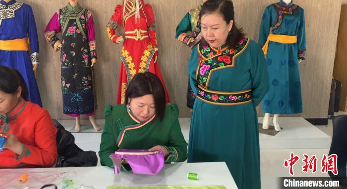 圖為田斯琴高娃正在指導蒙繡技藝。 烏瑤 攝