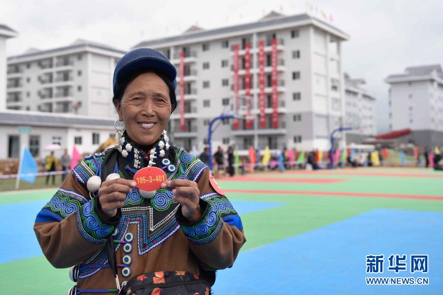 在布拖縣依撒社區(qū)安置點抽簽分房現(xiàn)場,56歲的阿比么日扎展示自己抽中的新家房號(6月21日攝)。新華社記者 胥冰潔 攝