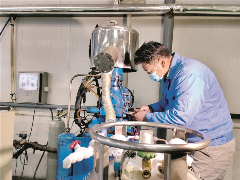 圖為拉瓊在檢修液氮機。拉薩融媒記者 莫瑞英攝