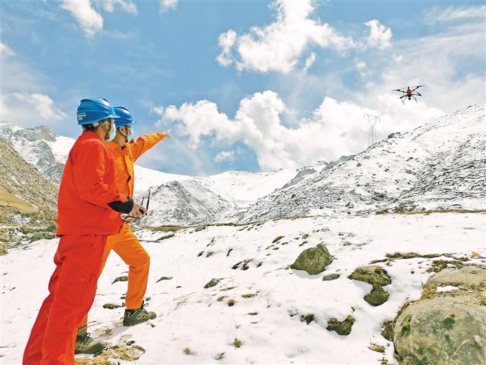 圖為國網(wǎng)西藏電力有限公司檢修公司兩名員工用無人機(jī)巡視220千伏墨山線。 王嘯天 記者 拉巴桑姆 攝
