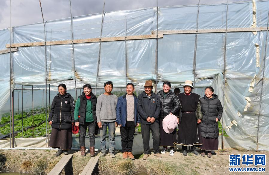 陳千(左四)和甲日卡村村民及溫室大棚種植戶在大棚前合影(2月25日攝)。新華社記者 晉美多吉 攝