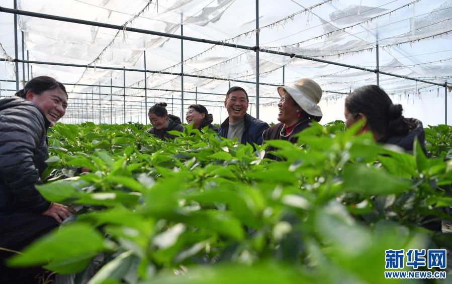 陳千(前)和種植戶在大棚里查看蔬菜長(zhǎng)勢(shì)(2月25日攝)。新華社記者 晉美多吉 攝