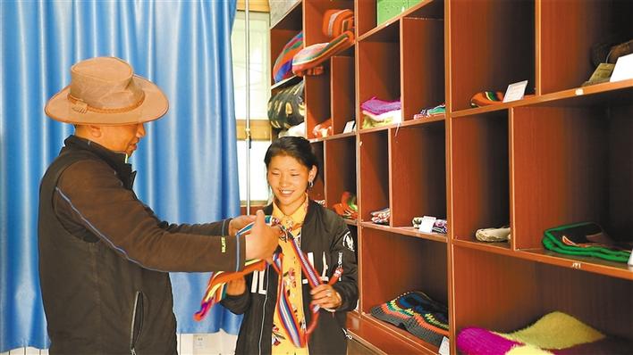 圖為在措勤縣民族特色產(chǎn)業(yè)線下體驗館工作的貧困戶頓珠(右)為顧客推介當(dāng)?shù)禺a(chǎn)品。記者 溫凱 洛桑旦增 攝