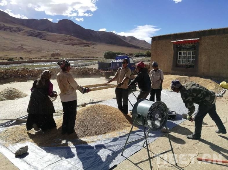 工作隊根據(jù)在前期深入群眾家中和田間地頭了解到的“孤困寡”等人群在秋收中存在勞動力緊缺等問題,號召全體駐村隊員和村黨員干部組成青稞秋收黨員志愿服務隊自2017年9月13日起,對村孤寡戶、缺乏勞動力戶及特困戶進行秋收幫扶,僅用3天就完成困難戶的收割,解決了他們勞力緊缺的燃眉之急。9月底,拉木堆村的秋收工作已經(jīng)進入收尾階段。村民們都說,今年因為有收割機,收割時間比去年縮短了兩天。當全村408畝青稞全部收割完畢,堆置田地中晾曬。聽說今年糧食產(chǎn)量預計將比上年增收10%左右,再創(chuàng)新高,從干部到群眾,人人樂開了花。