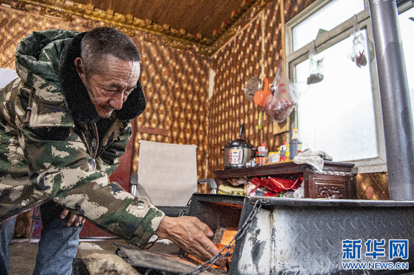 在易貢鄉(xiāng)通加村擔(dān)任村黨支部書(shū)記的索朗次仁給爐子生火(4月1日攝)。新華社記者 孫非 攝