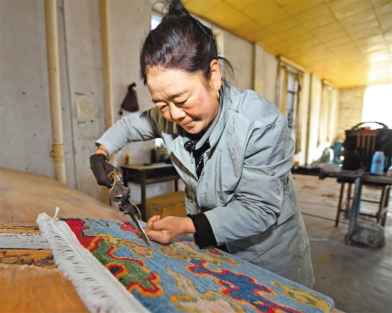 左圖為拉薩喀瓦堅(jiān)手工藏毯公司工人對藏毯進(jìn)行立體裁剪。 記者 唐斌 攝
