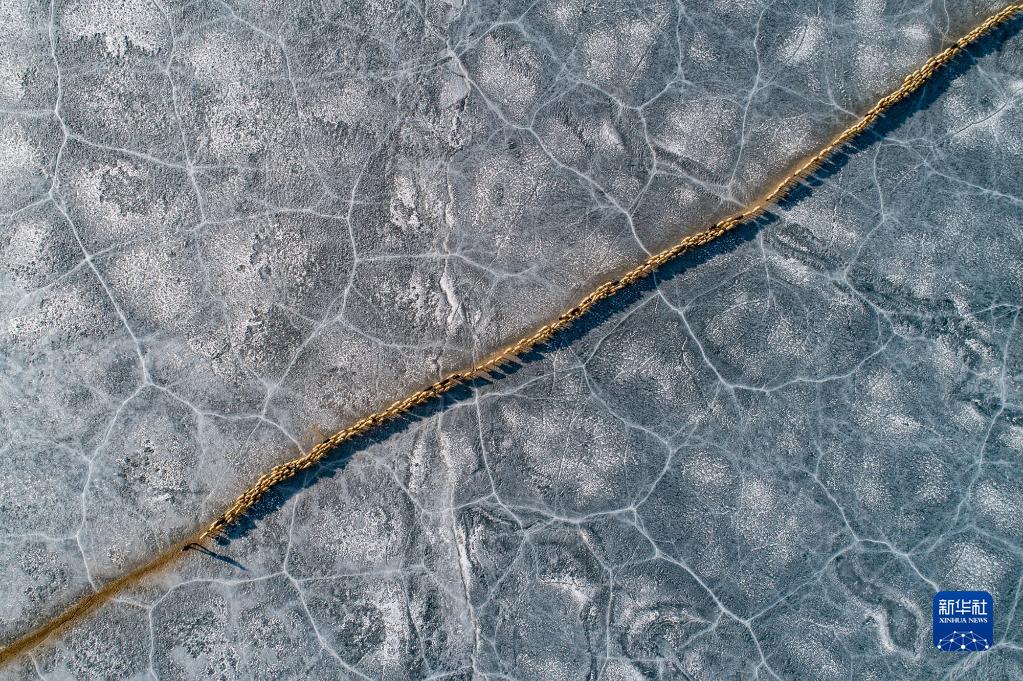 羊群順著安全小路通過普莫雍錯(cuò)冰湖。新華社記者 孫瑞博 攝