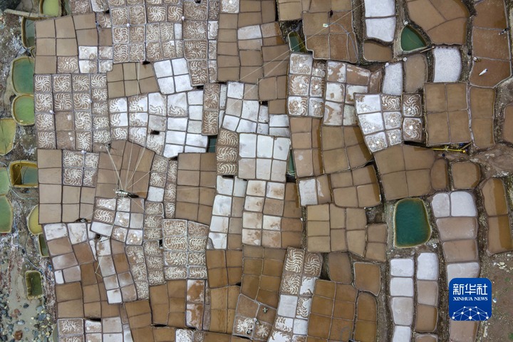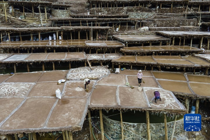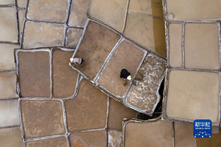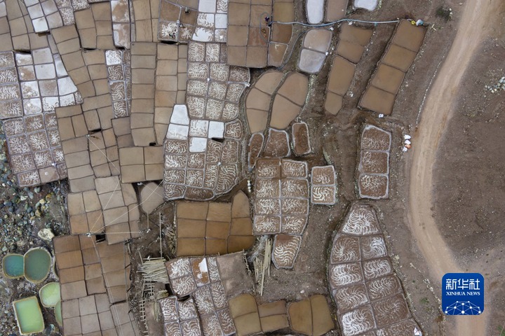 加達(dá)村村民在古鹽田里勞作(無人機(jī)照片,5月26日攝)。新華社記者 周荻瀟 攝