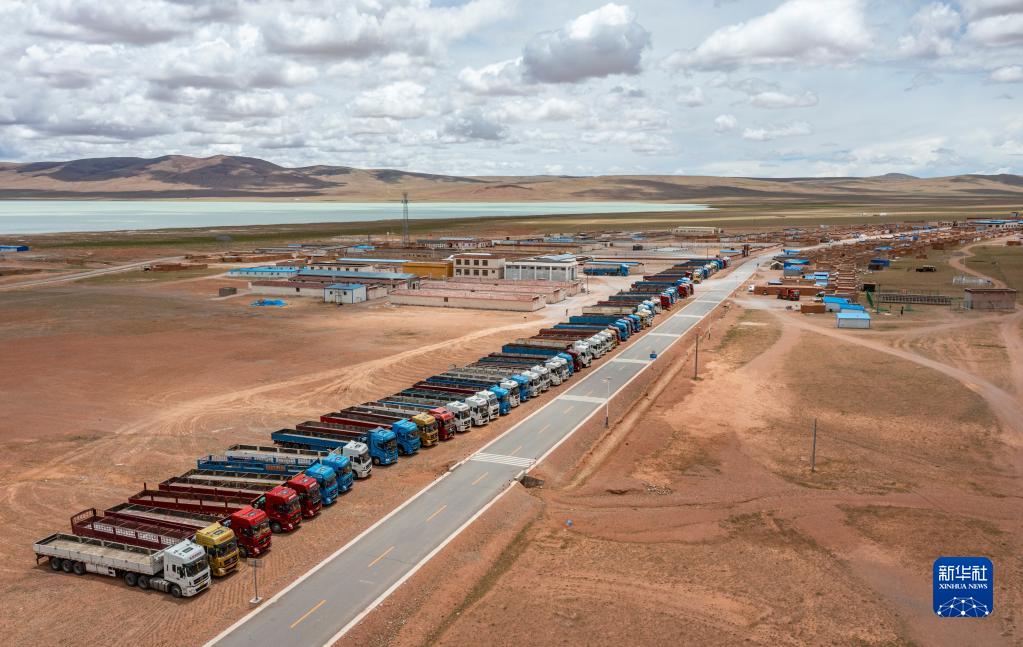 在雙湖縣多瑪鄉(xiāng)拍攝的負(fù)責(zé)運(yùn)送搬遷群眾家具的貨車(7月12日攝,無人機(jī)照片)。新華社記者 孫非 攝