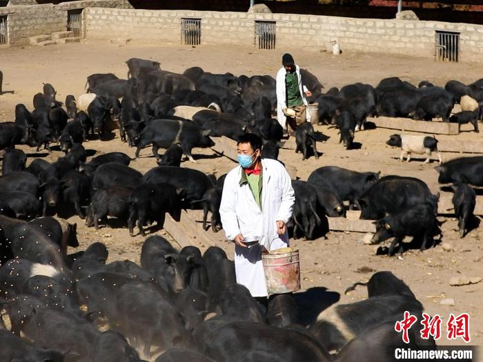 圖為飼養(yǎng)員正在給藏香豬喂食?!⊥恋┣z