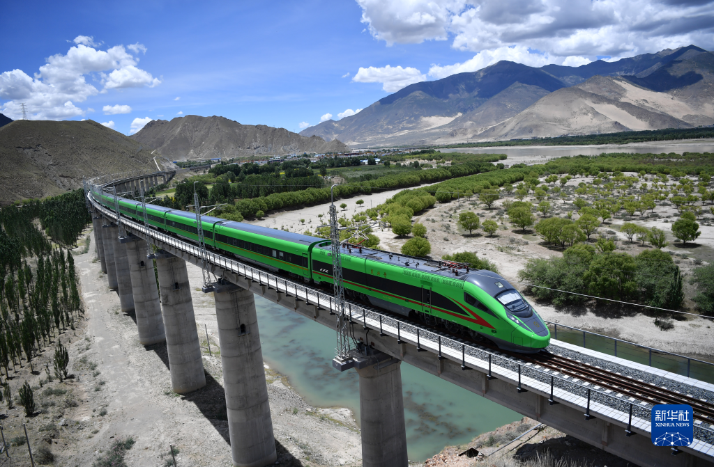 這是行駛在西藏山南市境內(nèi)的復(fù)興號(hào)列車。(2022年6月22日攝)。新華社記者 覺果 攝